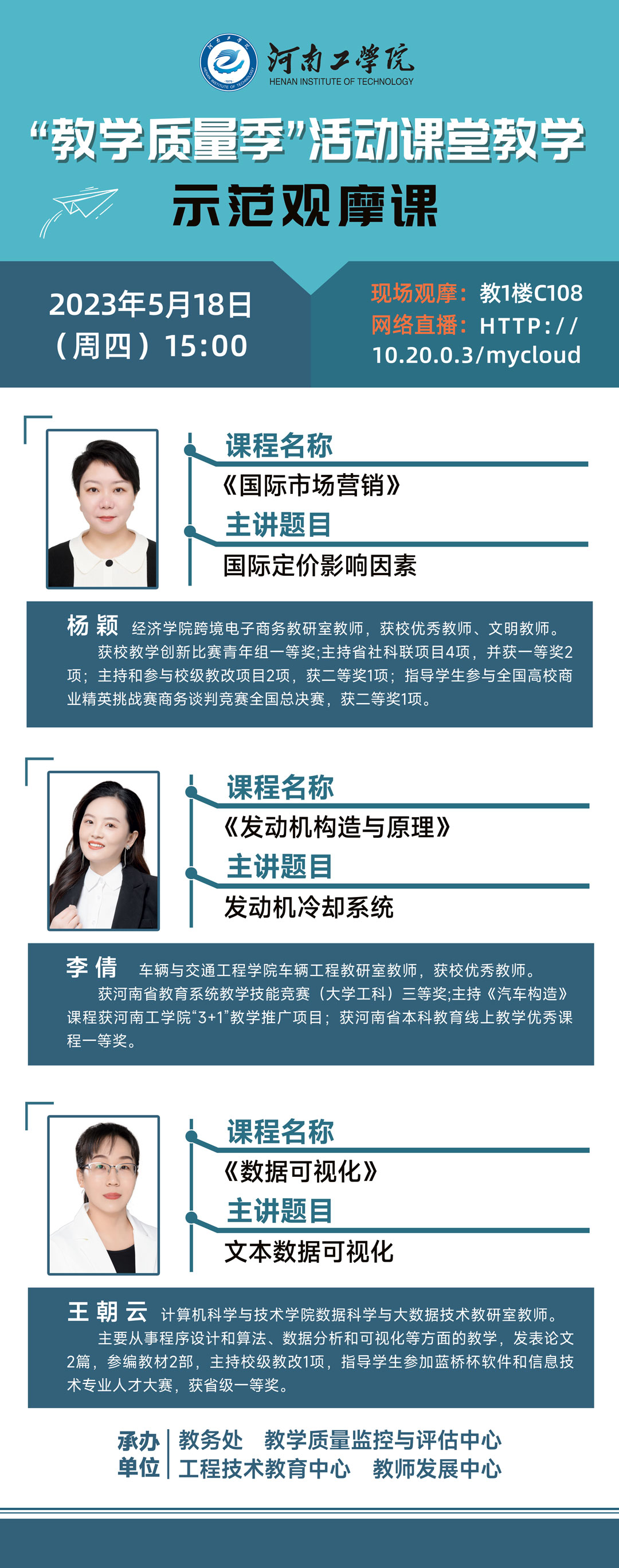 为深入学习贯彻党的二十大精神,充分发挥优秀教师的示范引领作用,促进教师之间教学经验的学习交流,进一步提高教育教学质量,为我校高质量通过本科教学工作合格评估提供有力保障,经研究,特举办本次“河南工学院‘教学质量季’活动课堂教学示范观摩课”。现将有关事宜通知如下: