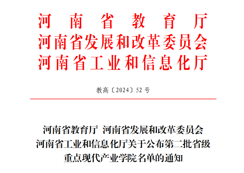 近日,河南省教育厅、河南省发展和改革委员会、河南省工业和信息化厅联合发布了《关于公布第二批省级重点现代产业学院名单的通知》,我校申报的“智慧电气现代产业学院”获批立项建设。截至目前,我校共获批省级重点现代产业学院2个。
