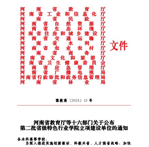 近日,河南省教育厅、河南省工业和信息化厅、河南省民政厅等十六部门联合发布了《关于公布第二批省级特色行业学院立项建设单位的通知》,我校申报的“智能物料搬运装备行业学院”获批立项建设。截至目前,我校共获批省级特色行业学院2个。