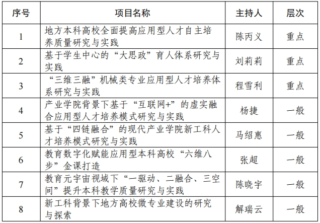 本次获批立项的项目聚焦高质量应用性本科建设、课程思政建设、金课建设等高等教育热难点问题,积极探索人才培养新机制、新模式和新举措,对于进一步提升我校教育教学研究水平,推进思政教学改革、创新创业能力提升、新工科建设等都具有积极作用。