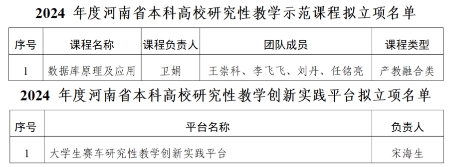 近日,省教育厅公示了2024年度河南省本科高校研究性教学示范课程和创新实践平台拟立项名单,《数据库原理及应用》拟获批立项研究性教学示范课程,《大学生赛车研究性教学创新实践平台》拟获批立项研究性教学创新实践平台。