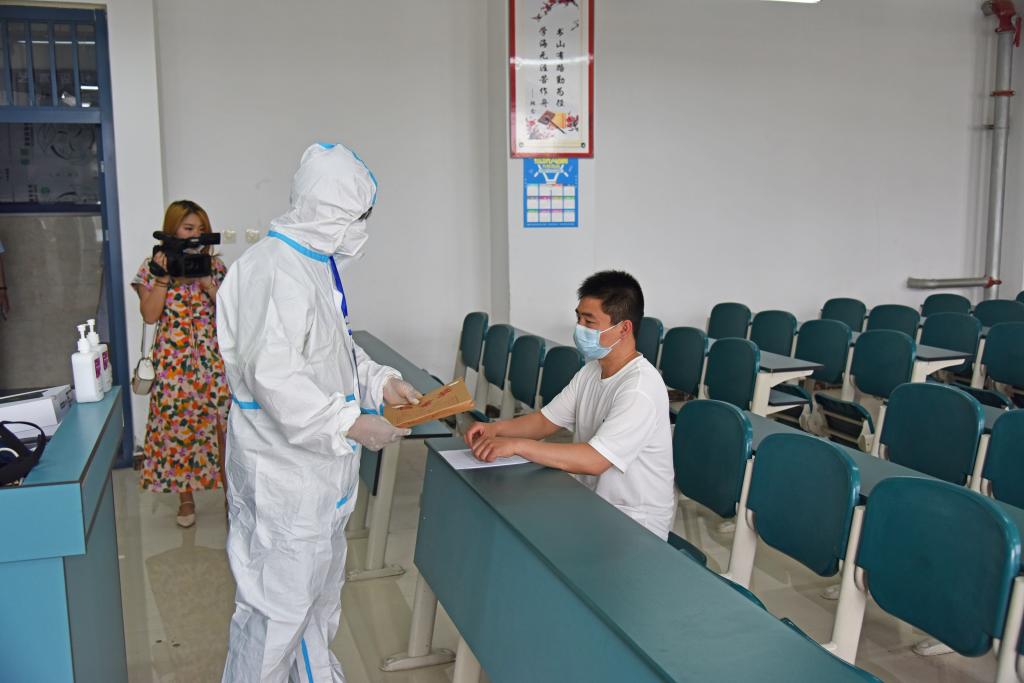 本次演练针对师生在校内、市区内、集中隔离点等不同场景居住的实际,主要模拟了考点入口发现体温异常、考场楼入口发现体温异常、考场考试过程中突然报告身体发热等不适症状、启用专用隔离考场等四个场景的全流程应急处置。对于考点入口和考场楼入口处发现体温异常者,经过复测、综合研判、上报请示后启用专用隔离考场的,学校派防疫专用车辆“点对点”将体温异常考生送至专用防疫隔离通道,考生经由唯一性的专用防疫隔离通道直达专用隔离考场,全流程实现闭环管理。考试中发现身体异常者,经过复测、综合研判、上报请示后,在防疫人员的指导下对考生答卷等考试材料进行必要的防疫处理后封装,由两名身穿防护服的工作人员将其一并转移至专用隔离考场,全程录音录像。专用隔离考场3名监考老师身穿防护服,对身体异常考生进行了无声入场、身份核验、座位安置、试卷发放、试卷回收封装与消毒等一系列认真细致的演练,并在考试结束后对考场桌椅、门把手等进行全面消杀。