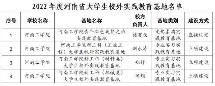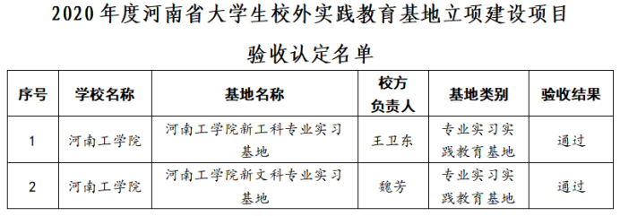 近日,河南省教育厅公示了河南省本科高校大学生校外实践教育基地名单,共直接认定88个、立项建设120个本科高校大学生校外实践教育基地。我校申报的4个校外实践教育基地,1个被直接认定,3个获批立项。另外,我校2个2020年度立项建设基地顺利通过验收。