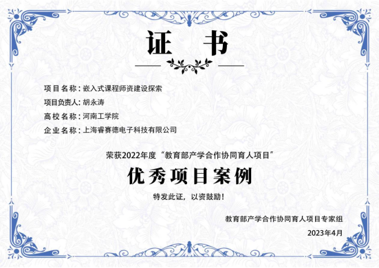 我校电气工程与自动化学院与上海睿赛德电子科技有限公司于2019年起开展校企合作,建立了产学研长期合作关系。双方共同聚焦企业嵌入式人才招聘和高校嵌入式人才培养及师资建设需求,以产学合作项目为牵引,共同举办嵌入式师资培训及教学研讨会议20余次,分享并交流嵌入式课程建设及改革经验,探索产教融合、协同育人新途径,会议覆盖国内200余所高校,累计培训嵌入式师资600余人,为嵌入式师资建设做出了重要贡献。