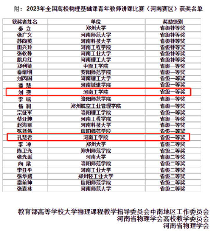 近日,全国高等学校物理基础课程青年教师讲课比赛(河南赛区)在河南科技大学落下帷幕,经过激烈角逐,我校理学部教师刘潇、孔慧君均获得一等奖,取得了优异成绩。