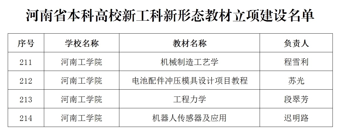 近日,河南省教育厅公布了河南省本科高校新工科新形态教材立项建设名单,我校申报的《机械制造工艺学》、《电池配件冲压模具设计项目教程》、《工程力学》和《机器人传感器及应用》4部教材获批立项建设。