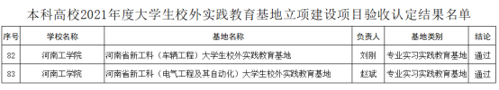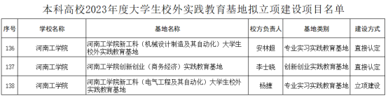 近日,河南省教育厅公示了2023年度大学生校外实践教育基地拟立项建设项目名单和2021年度立项建设基地拟验收认定结果名单,我校“新工科(机械设计制造及其自动化)大学生校外实践教育基地”、“创新创业(商务经济)实践教育基地”获批直接认定,“新工科(电气工程及其自动化)大学生校外实践教育基地”获批立项建设。同时,我校2个2021年度立项建设基地全部顺利通过验收。