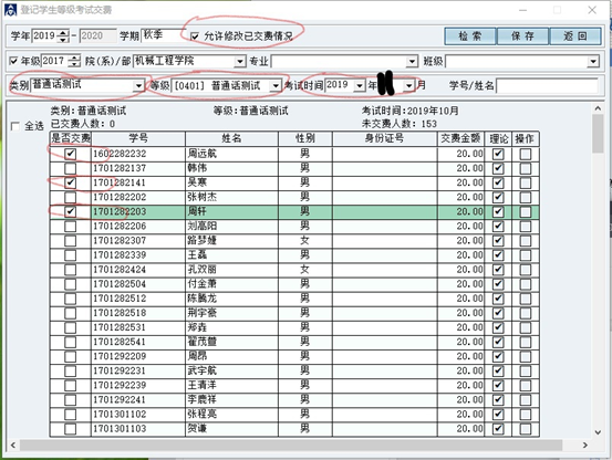 如图:若已确认周远航、吴寒、周轩三名同学已缴费,则在是否缴费选项中选中该生,保存即可。