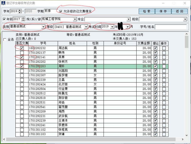 如图:若已确认周远航、吴寒、周轩三名同学已缴费,则在是否缴费选项中选中该生,保存即可。