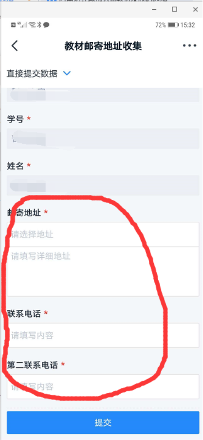 (2)点击“教材邮寄”,进入教材邮寄地址收集,填写邮寄地址和联系电话,核对无误后,点击“提交”